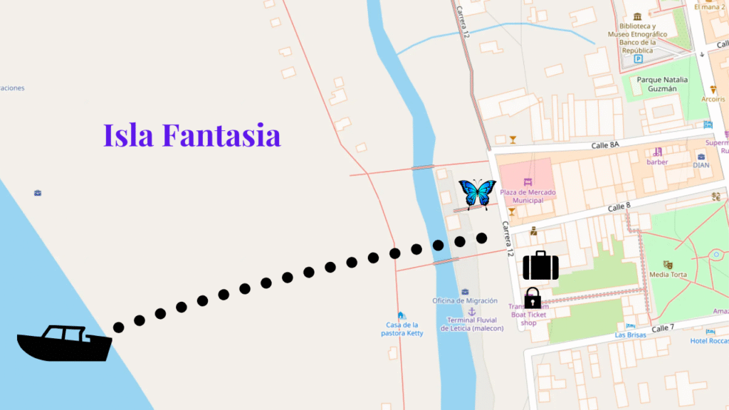 En caso de inconvenientes o retrasos: diríjanse directamente a “Balsa de Rápidos a Puerto Nariño” en la Isla de la Fantasía — está aproximadamente a 15 minutos caminando desde la escultura de la Mariposa.